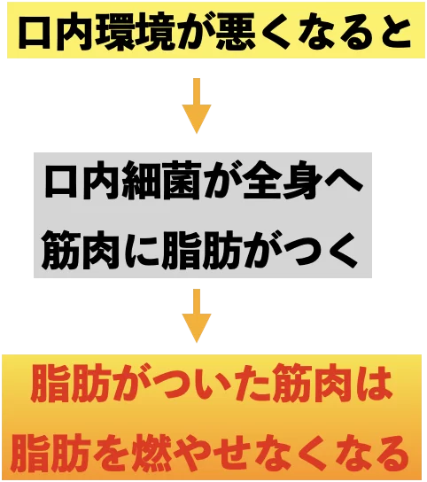 口内環境が悪くなると、口内細菌が全身に回って筋肉に脂肪がつく