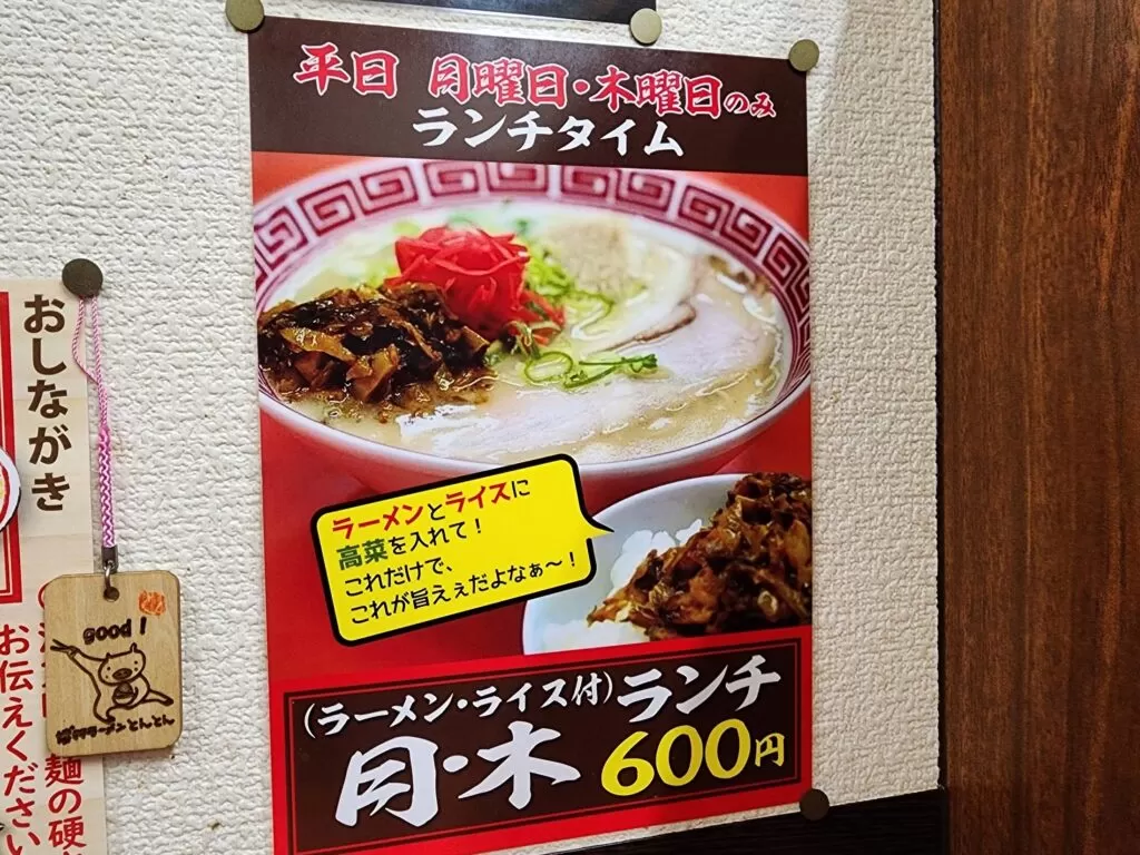 博多ラーメンとんとん中庄店は平日の月曜日・木曜日のランチタイムはラーメンライスが600円とお得