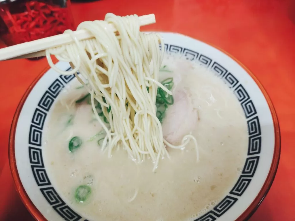 スープは2日間かけてじっくりコトコト煮込んだ豚骨スープで、ほんのり甘くさっぱりとした味わいであると評判である