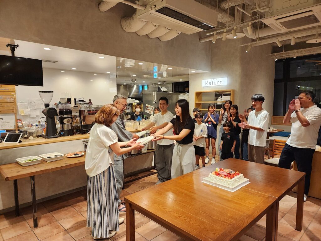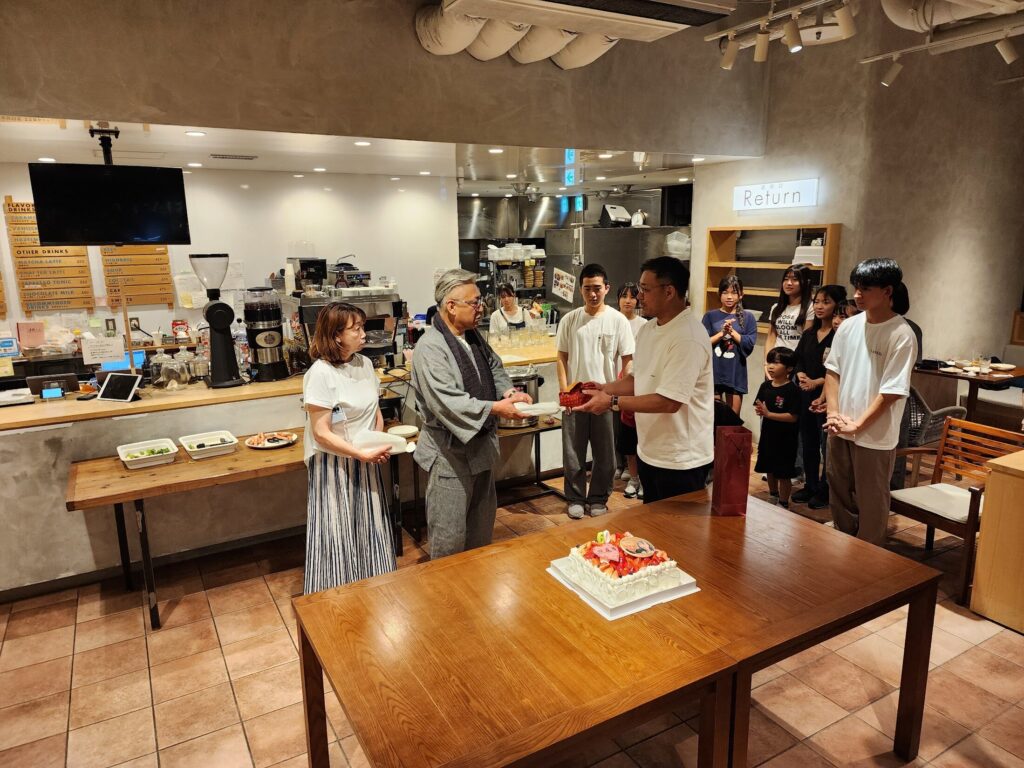 生徒から還暦&生誕祭のプレゼントを渡す
