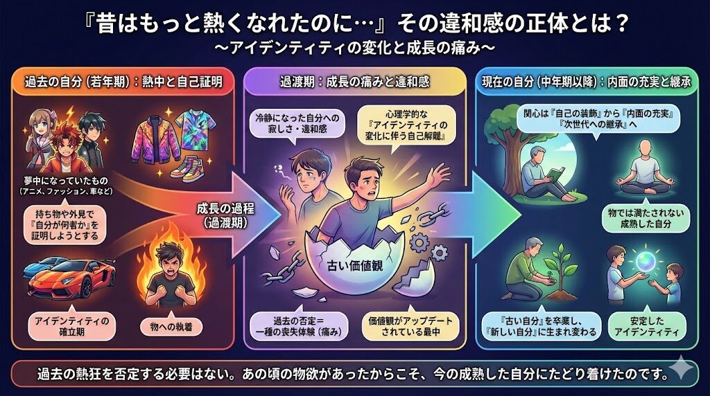 かつての自分が夢中になっていたもの(アニメ、ファッション、車など)に対して、冷静になった自分に寂しさや違和感を覚えることがあります