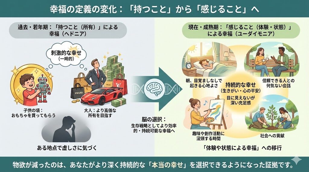 これらは形がないため、一見すると「欲がなくなった」ように見えますが、実はより本質的で洗練された欲望へと進化しているのです