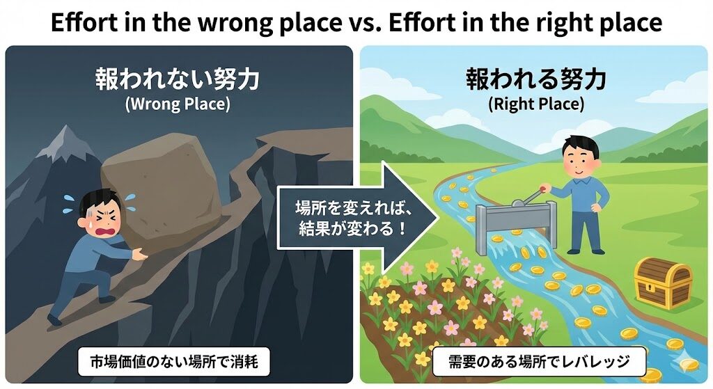 努力が評価されるかどうかは、その量よりも「どこで、誰に対して行っているか」という市場価値や需要によって決まります