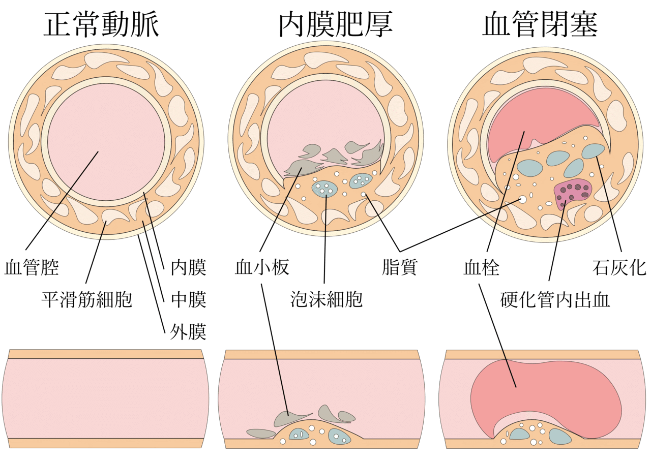 動脈硬化は「高血圧」からの「糖尿病(高血糖)」からの「脂質異常」からの行き着く先の現象で、血管が硬くなり詰まりやすくなる現象