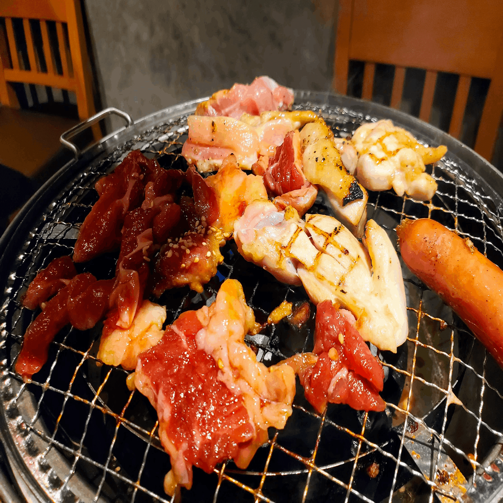 この食べ放題の内容には肉(牛・豚・鶏・ホルモン赤身・ホルモン白身・ソーセージ・つくね)のほか、ごはん、カレー、スパゲティサラダ、キャベツ、唐揚げ、キムチが含まれる